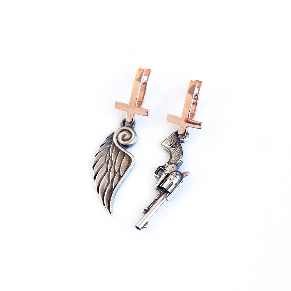 Серьги кресты золотые, Крыло и пистолет серебряные, чернение. Цена указана за пару.